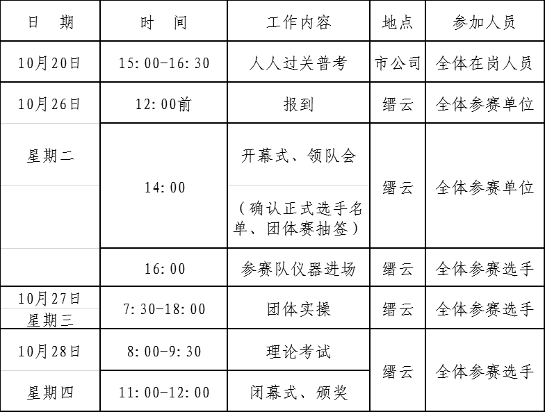 3.理论比赛要求参赛选手(含备用)参与,选用闭卷书面考试方式,考试时刻90分钟,满分100分,选手独立完结。考试内容含变电运维、变电一次检修、二次检修、电气实验等理论知识、规程规则、文件等