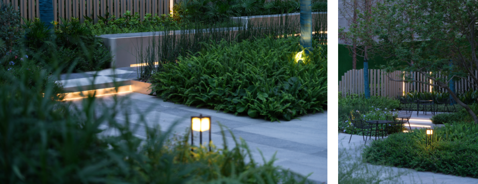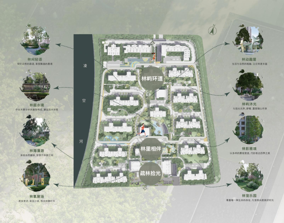林庭水境”由中央水景与休闲廊架构成,开放式的休闲、社交空间,以丛生乌相为主乔木搭配色彩素雅的花境,形成具有丛林气息的现代林下空间,“林屿环道”健康环形跑道,让生活的压力,伴随着运动悄然释放,营造PARK生活场景。